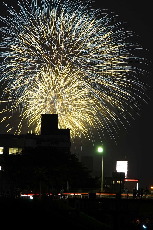 撮影は、すたーマインのように連続的に上がる場合は、適当な時刻にシャッターを開けて数秒で閉じればOKです。尺玉のように単発で上がる場合は、花火が開く直前にシャッターを開け、花火が垂れ下がる直前に閉じると普通に撮影できます。あとは、各個人の工夫でしょう。