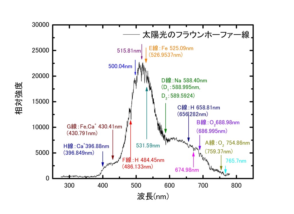 上のようにして、色々な照明のスペクトルを測定してみました。蛍光灯のほか、別の種類の蛍光灯、白熱電球やクリプトンランプ、ハロゲンランプ、そして太陽光、この雑記長で全てを紹介するのは無理があるので、後で整理して掲載します。ここでは、太陽光について紹介しましょう。太陽光は一般に連続光といわれていますが、太陽スペクトル中には左のスペクトルの様に幾つかの暗線(吸収線)が見られます。これらは、Joseph von Fraunhoferによって1814年発見されました。これらは、太陽からの光が、途中の太陽大気中の原子や、地球大気中の分子によって共鳴吸収されるために生じたものです。現在では数万本のスペクトルが確認されていますが、この分光器で確認できるのは、グラフのような吸収スペクトルです。