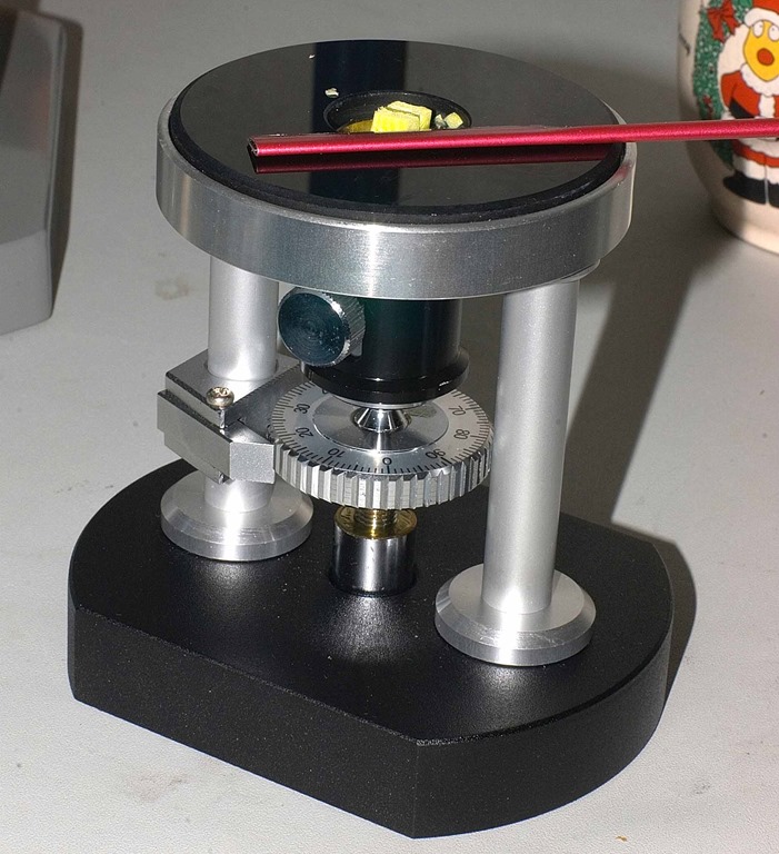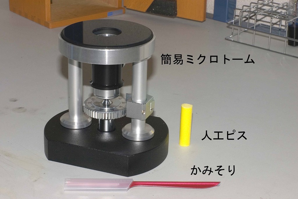 生物顕微鏡は、高倍率になればなるほど、その焦点深度が浅くなるために観察しにくくなります。従って、薄い試料ほど観察に向きます。例えば、今まで顕微鏡で観察してきた花粉や口腔上皮細胞などは100μm以下の大きさですので、数回焦点を動かすことで観察できます。しかし、植物の葉や茎等の厚い試料の断面を観察するためには、薄い切片を作る必要があります。そのためには、ニワトコの髄や人工ピス、ミクロトームなどを使用して薄い切片をつくります。右の写真は簡易ミクロトームと人工ピス、そしてかみそりです。