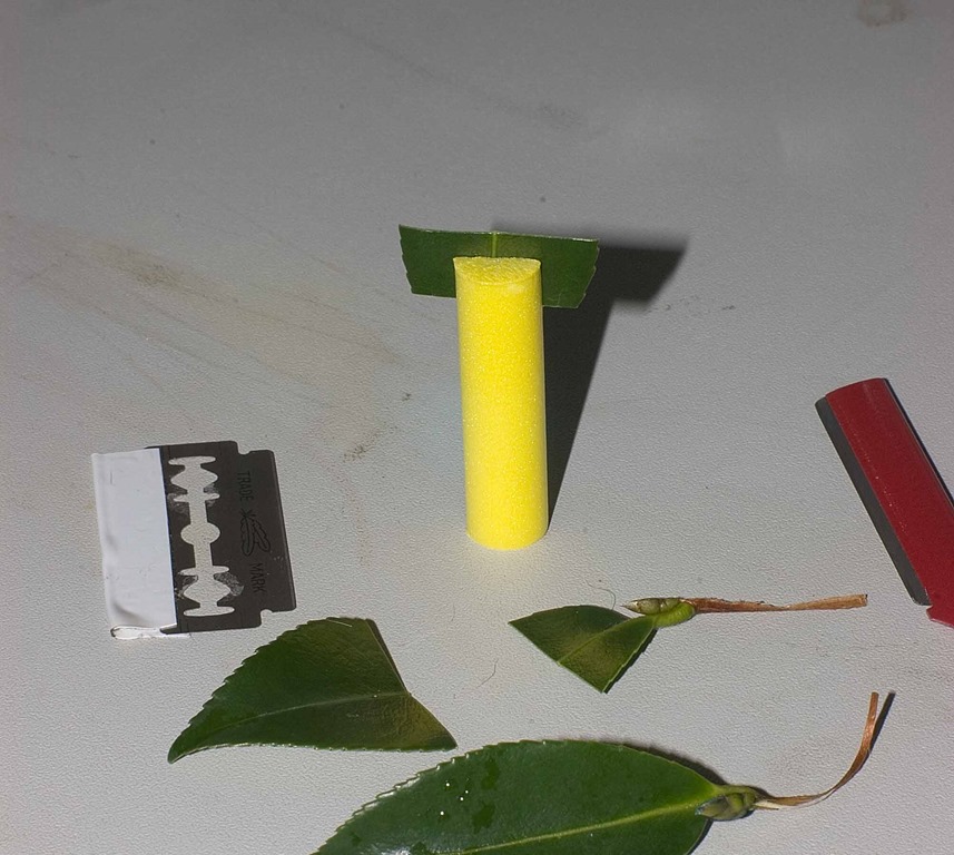 ⑤写真のように人工ピスの切り込みに切り取ったサザンカの葉を挟み、人工ピスからはみ出た葉をかみそりで切り取ってしまいます。