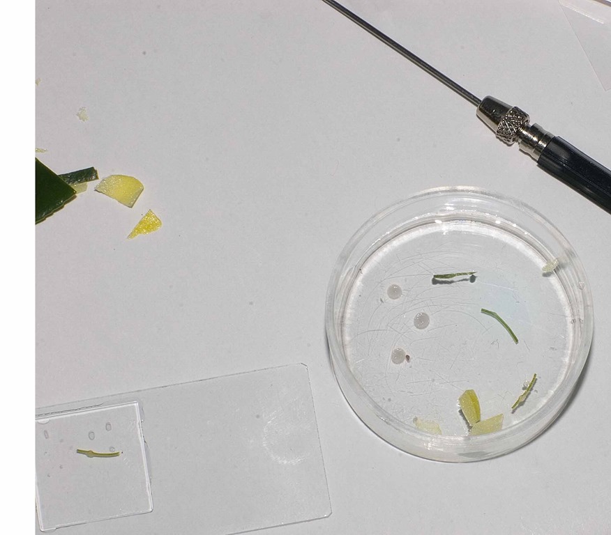 この場合は、葉を挟んだ人工ピスを葉と一緒に薄く切り取ります。何枚も切り取り右の写真のようにシャーレの中の水に浮かべます。