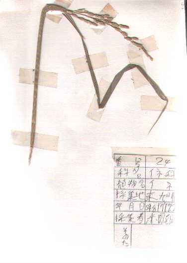 イネ科の一年草でいわゆるお米になるものです。原産は東南アジアで、水田に栽培される水稲が一般的で、まれに陸稲が畑で栽培されることもあります。日本では弥生時代から栽培されていて、農業上最も重要な作物で、米不足のときに輸入米が話題に上ったのは記憶に新しいところです。高さ1m程度で、葉は標本に見られるように線形で互い違いに生えます。夏から秋の頃、標本のように茎頂に多数の小穂からなる花穂をつけ、これを脱穀したものが食卓に上るお米です。栽培品種は非常に多く、改良も進んでいます。成熟時期によって早稲(ワセ)・中稲(ナカテ)・晩稲(オクテ)等に分けられます。また澱粉の質により、もち米とうるち米に分類されます。