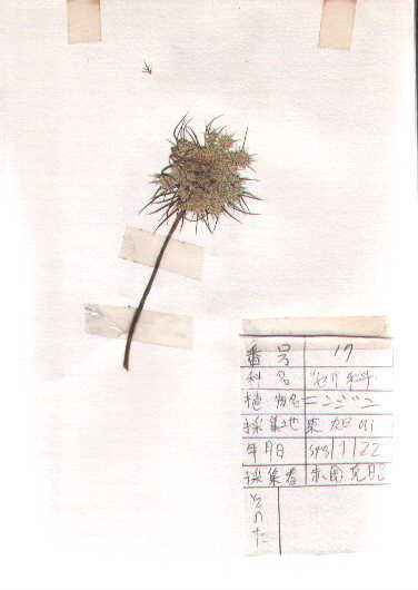 セリ科の越年草ですが、いわゆる食べるニンジンです。原産は地中海沿岸地方で、ご存知のように根は橙色の円錐形で、独特の匂い甘みがあります。このニンジンの匂いが嫌いで食べない人はニンジンの甘さが判りにくいでしょうが、最近のニンジンは匂いが弱く食べやすいですね。葉は根生(根から直接生え)し、羽状に細く裂けたように生えます。温帯地方で古くから野菜として栽培されていて、日本へは中国を経て渡来しました。花が咲く前に収穫してしまうのであまり花を見ることは少ないようですが、標本に見られるような花を咲かせます。