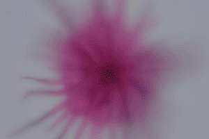 です。この場合、右の写真ように一部分にだけフォーカスが合って、多くの部分はピンボケになってしまいます。この写真からグミの燐毛は大きさがほぼ0.3mm程度と判りますので、0.65μmの焦点深度は大きさに比べて1/500になります。実際はカバーグラスで封入されているので、上から押しつぶされている状態になっています。