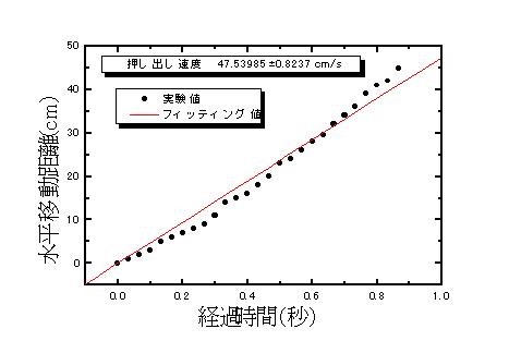graph2 最後に、この落下実験では、息子が2階のベランダの手すりに載せたボールを真横に押し出すことによって、落下を測定しました。この時、ボールは水平方向にも移動していますので、水平方向には同じ速度で移動しているはずです。そこで、分解写真から横方向の移動距離を出して、系か時間でグラフを描いたのが左図です。ほぼ直線祈っていることがわかりますね。この時の速度を求めると、47cm/sでした。これを時速に直すとほぼ1.7km/sとなり、歩く速さの半分くらいですね。